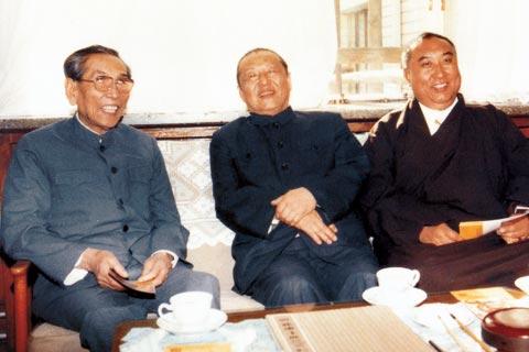 圖為1986年4月,習(xí)仲勛(中)與十世班禪(右)、阿沛?阿旺晉美(左)在一起。圖片來(lái)源:新華網(wǎng)