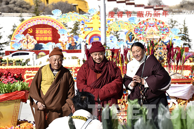 隨著工作人員按照規(guī)劃有序地將仿真花卉和絹花擺放,布達拉宮廣場上,藏漢雙語的“歡度春節(jié)藏歷新年”字樣逐漸成型。待巨大的切瑪盒擺放到位后,工作人員在切瑪盒兩側分別放入青稞和剛剛炒制出的糌粑,隨后插上綻放在新年里的“羅薩梅朵”,裝扮布達拉宮廣場。