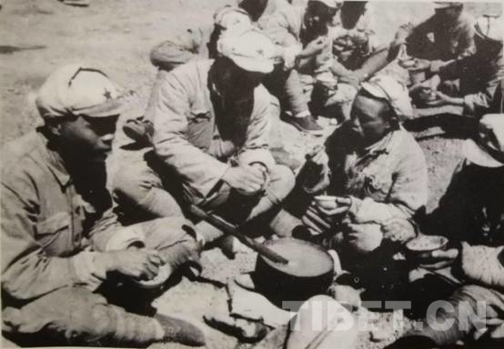 “當時吃飯會限額,一斤16兩,每人只能吃10兩,上午10點鐘開飯吃5兩,下午4點多鐘吃5兩。這時吃的糧食是進軍西藏時背進來的,還有采買的青稞。”郎杰說到:“在洗臉盆里一大碗湯,或者蛋黃蠟,買點元根,里面倒點辣椒和鹽巴,一個洗臉盆所盛為10個人的飯量。唱完歌就開飯。10個人蹲著吃,都先盛完。吃飯前先唱歌,比如當時唱的是‘解放軍的天,是明朗的天’……唱完后,連長說開飯大家才可以吃?!?/p>