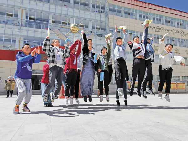 圖為結(jié)束藏語(yǔ)文考試的考生慶祝高考結(jié)束。來(lái)源:西藏日?qǐng)?bào) 攝影:王莉