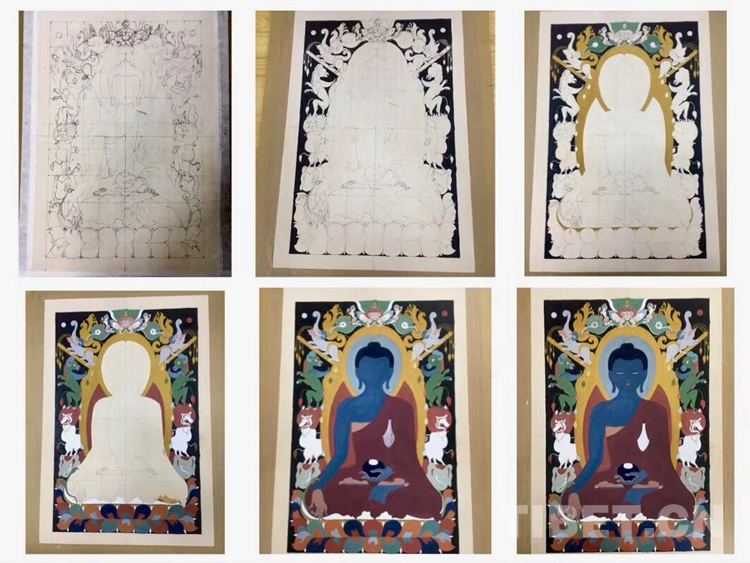 第三步:素描及設(shè)色。素描輪廓的依據(jù)是“圣跡圖像學(xué)”,那是圣賢們?cè)谮は胫杏^想到的各種神祗的容貌、各種神獸的形象,并記錄下來(lái)匯集成冊(cè)。畫師必須嚴(yán)格按照上面記載的人物樣貌、裝飾物、顏色來(lái)作畫,就連各種神獸所在的位置也完全不能有誤。