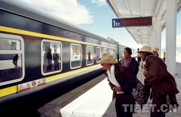 圖為藏族群眾欣喜地張望剛開(kāi)通的列車(chē)駛進(jìn)車(chē)站 攝影:陳丹