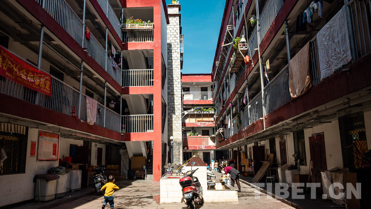 和門外熙熙攘攘的八廓街不同,大院里的生活卻是如此的靜謐、安寧。臨近中午,院子中央一名藏族婦女正在洗菜;見到生人的小男孩歡快地跑開;漢族老板的臨街理發(fā)店生意興隆。這座四層小樓翻修于2016年,常住人口也由之前的44戶129人增加到了68戶214人,人口增加了,大院的民族情誼也更加濃厚了。