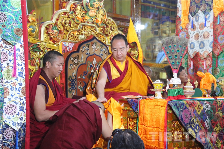 圖為十一世班禪在帕巴寺為僧人摸頂賜福 攝影:王淑