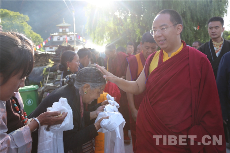 十一世班禪抵達(dá)強(qiáng)真寺,前往主殿朝拜禮佛,并帶領(lǐng)眾僧集體誦經(jīng)祈福。隨后,在寺廟正門為遠(yuǎn)道而來(lái)的信教群眾摸頂賜福。信教群眾得到了十一世班禪的摸頂賜福并領(lǐng)到了長(zhǎng)壽金剛結(jié)和十一世班禪像,十分幸福和開心,自發(fā)唱起了當(dāng)?shù)氐膫鹘y(tǒng)歌曲,歌聲悠長(zhǎng),充滿吉祥。