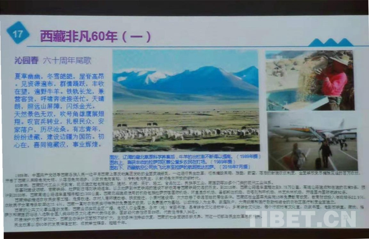 唐召明以照片敘事、詩詞抒情的形式,把西藏60多年來的發(fā)展變化和其間的感人瞬間展示出來,謳歌偉大的時代和詮釋這一偉大時代的“老西藏精神”。經(jīng)北京建藏援藏協(xié)會原副會長朱強(qiáng)配圖賦詩,有了“百首詩詞、百張圖文”的以詩配圖資料。一張張感人的照片和一首首充滿激情的詩歌,展示了在中國共產(chǎn)黨的領(lǐng)導(dǎo)下,新西藏在“短短幾十年,跨越上千年”的歷史巨變;道出了一切為了西藏人民的“老西藏精神”時代內(nèi)涵。全場聽眾凝神專注,不時響起熱烈的掌聲。