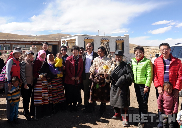 這是唐召明陪同中國(guó)評(píng)劇院藝術(shù)家和篩查先心病的北京安貞醫(yī)院小兒心臟病專家顧虹,來到藏北班戈縣青龍鄉(xiāng)采風(fēng)、篩查先心病,并與牧民群眾合影留念。(唐召明提供,2015年10月8日攝)