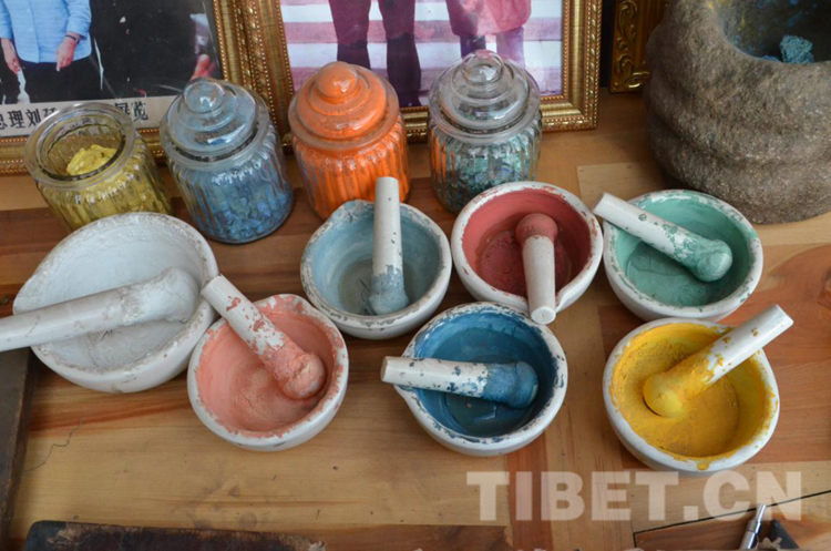 在門口的桌上,西熱秋久拿起一本泛黃的藏書籍向我們介紹,這是家中祖祖輩輩流傳下來的“繪畫標準”,里面記載了各類造像的比例。在學習繪制唐卡時,必須從造像的經(jīng)典比例入手,對人體結構有所了解后,再開始衣飾形象的臨摹訓練,期間需要學習畫布、毛筆的制作,礦、植物顏料的研磨、泡制、使用等技巧。