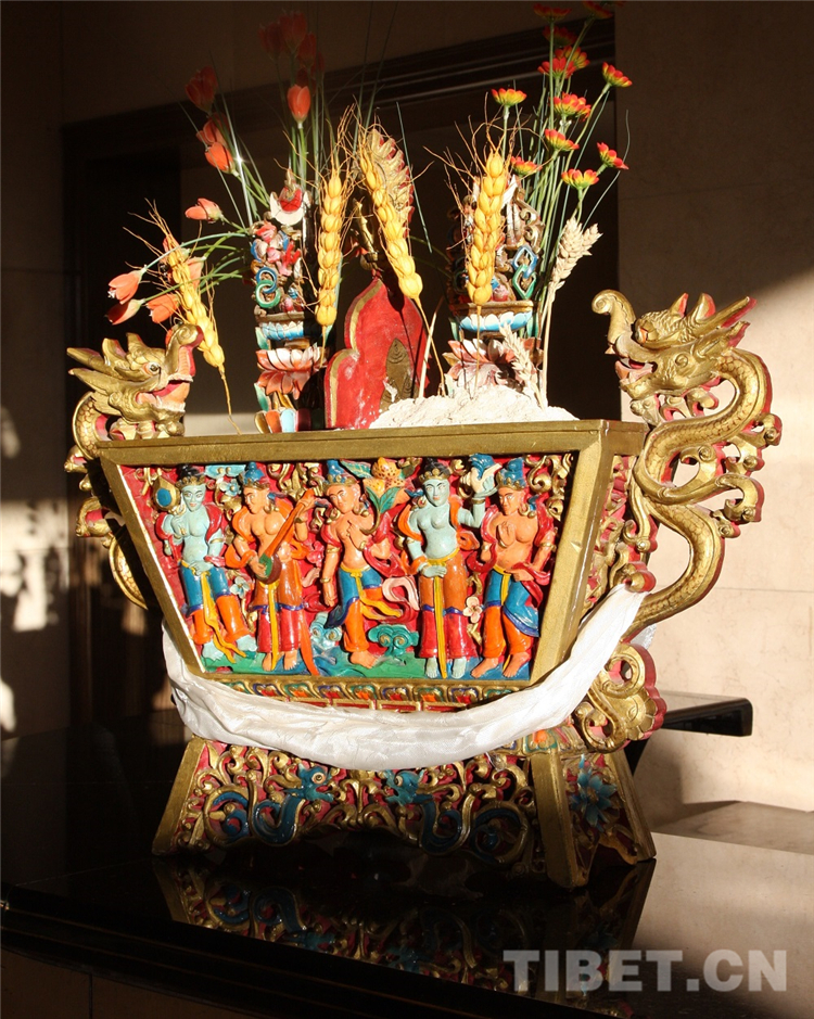 藏歷1月1日,是藏族人民一年一度最重要的節(jié)日。在拉薩,從藏歷12月初開始,我的鄰居們就開始打掃衛(wèi)生、準(zhǔn)備年貨了,其中,木雕彩繪的精致方斗“切瑪”和一些面粉制作的點心是每家必備的供品?!扒鞋敗眱?nèi)裝滿酥油拌好的糌粑、炒熟的青稞和人參果等食品,上面插上青稞穗、雞冠花,有的還要撒上酥油做的彩花板。同時,供品的旁邊還要擺放一個彩色酥油花塑的羊頭,到了初一那天,再將提前浸泡長出兩寸青苗的青稞種子擺于佛龕茶幾之上。這些擺設(shè)表達著對新的一年風(fēng)調(diào)雨順、農(nóng)牧業(yè)獲得豐收祈愿。