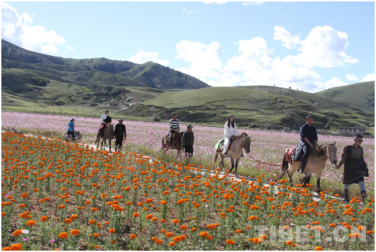 從理塘縣前往稻城亞丁機(jī)場(chǎng)方向60多公里,翻過(guò)一座小山坡,一片如夢(mèng)似幻的花海景觀瞬間映入眼簾。曾經(jīng)名不見(jiàn)經(jīng)傳的小山村——濯桑鄉(xiāng)漢戈村已實(shí)現(xiàn)“沙化地”到“花海”的蛻變,成為新的網(wǎng)紅打卡點(diǎn)。在花團(tuán)錦簇間拍照、在草原上騎馬,或者到旁邊康藏陽(yáng)光種植基地采摘“極地果蔬”、購(gòu)買農(nóng)民合作社的原生態(tài)農(nóng)副產(chǎn)品……游客可盡興體驗(yàn)。