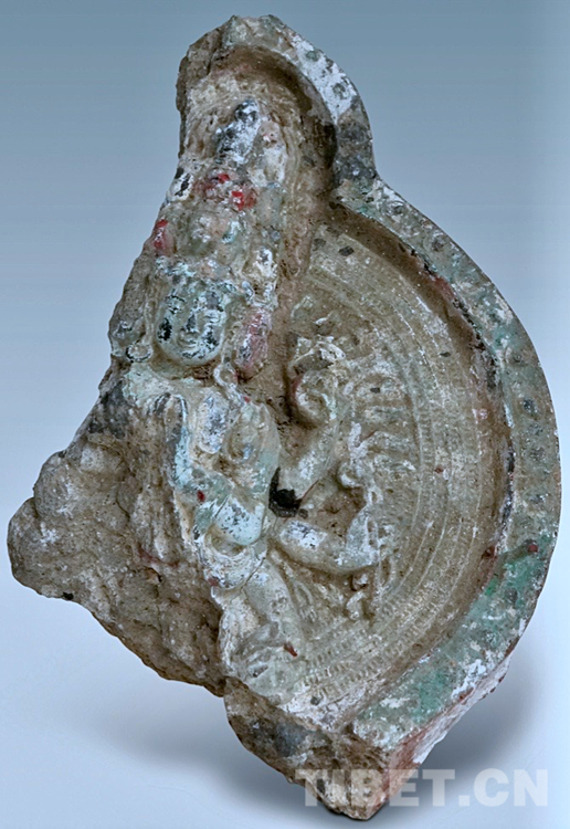 我問小和尚,我可以請一個走嗎?小和尚愣了一下,跑開去問旁邊的大和尚,回來時搬了一個凳子,爬上去幫我拿。他挑了兩塊相對完整一點的殘件給我,我如獲至寶。淡彩的千手觀音,光殘件就有20多公分高,實在是很大尺寸的擦擦?;厝サ穆飞?,怕兩塊寶貝在車?yán)锉慌鲋?,我用自己的衣服把它們裹得?yán)嚴(yán)實實?;氐奖本?,抱上其中一塊,送去給了我最最尊敬和喜愛的藏學(xué)老師,和他一起鑒賞,聽他給我解讀。