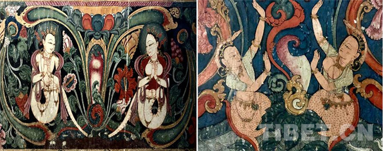 托林寺以龍女為代表的女性形象,留給我極深的印象,她們一方面?zhèn)鬟_(dá)的是宗教的光明和神圣,表現(xiàn)形式卻又是世俗的抒情性和誘惑性并存。端莊的面龐,優(yōu)雅的微笑,半裸的豐滿身軀扭轉(zhuǎn)出性感的曲線,置身于繪滿的花草圖案中,極盡優(yōu)美。當(dāng)我走進(jìn)這些畫(huà)作中,看著看著就迷失了,常常不知她們是人還是神,那空間是人間還是天國(guó)。(中國(guó)西藏網(wǎng) 文、圖/陳丹)
