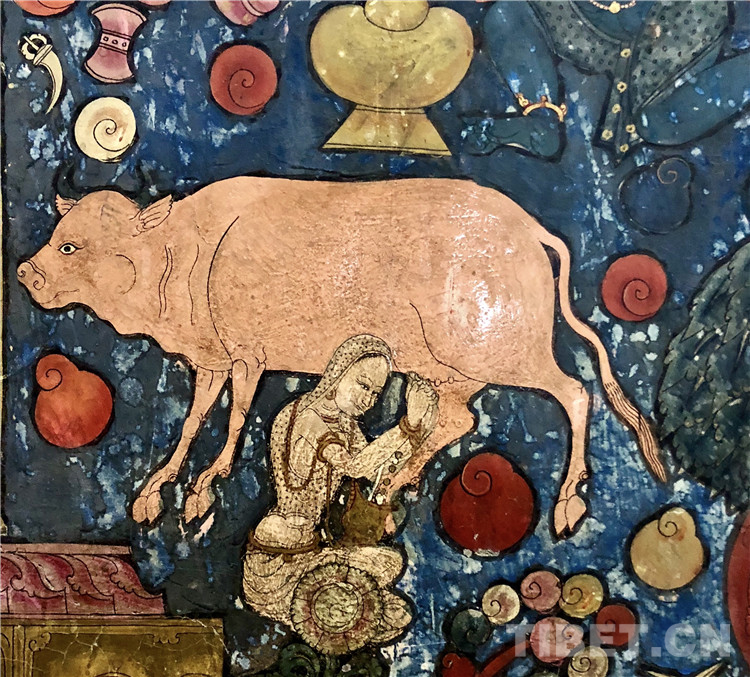 對(duì)于世俗生活的紀(jì)實(shí)性記錄,是古格時(shí)期壁畫(huà)的一大貢獻(xiàn)。生活場(chǎng)景、器物大量出現(xiàn)在托林寺壁畫(huà)中,圖中擠奶女子的神情很專注,牛也安靜得好似在享受。乳汁從女子兩肘之間流入她身前的罐子里。人和動(dòng)物的比例都很精準(zhǔn),在大面積深色的背景上,畫(huà)家選用了淺色來(lái)描繪這個(gè)畫(huà)面,使得這微小的細(xì)節(jié)非常醒目。牧業(yè)一直是阿里地區(qū)的主要產(chǎn)業(yè),擠奶、制作奶制品是當(dāng)?shù)孛课徊刈鍕D女都會(huì)的家務(wù)。在自由創(chuàng)作的區(qū)域,壁畫(huà)創(chuàng)作者很自然地將這日常勞作描繪出來(lái)。但是,女子的服飾是印度風(fēng)格,牛也不是青藏高原特有的牦牛,說(shuō)明了當(dāng)時(shí)古格藝術(shù)對(duì)外域文化的開(kāi)放性。