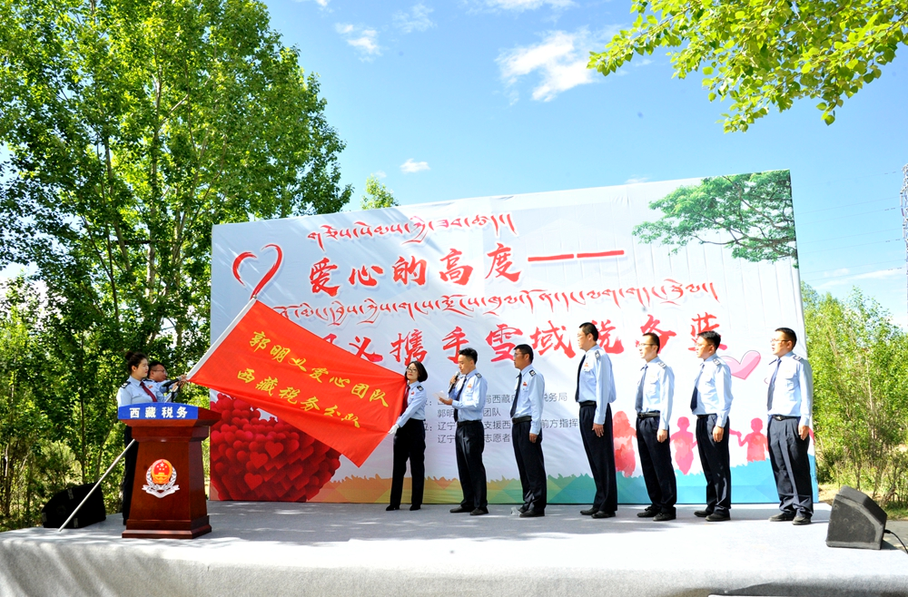 接過“郭明義愛心團(tuán)隊(duì)西藏稅務(wù)分隊(duì)”的大旗,一組青年稅務(wù)干部登臺(tái)宣誓。稅務(wù)干部次仁頓珠說,加入郭明義愛心團(tuán)隊(duì)既光榮,又是一份沉甸甸的責(zé)任,要將這份愛心傳承好、發(fā)揚(yáng)好,用心、用情投入公益事業(yè),在決戰(zhàn)脫貧攻堅(jiān)、決勝全面小康的舞臺(tái)上展示稅務(wù)藍(lán)、貢獻(xiàn)稅務(wù)力量。