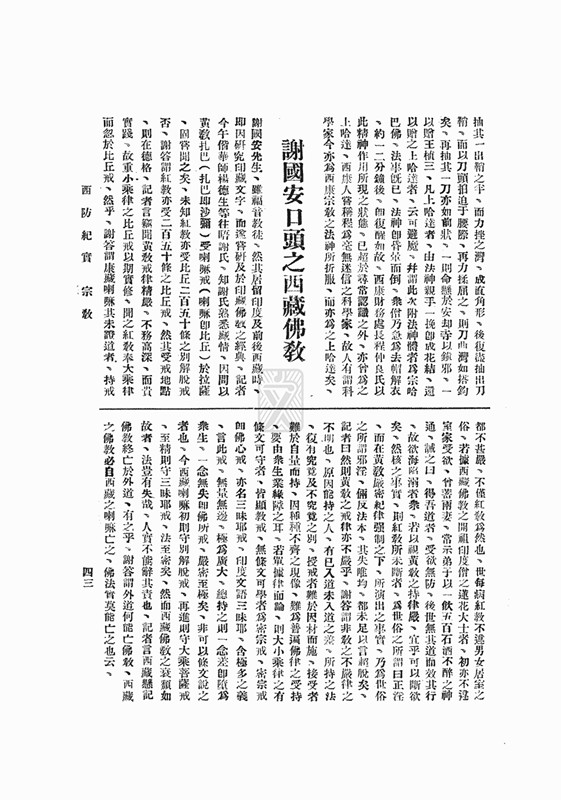 1887年,謝國安出生在今四川省甘孜縣絨壩岔。他的藏名為多吉卓巴,后因信仰基督教,取名Paul Sherap(人稱智慧保羅,我們注意到此名帶有藏文音譯),漢名謝國安。10歲時,他離開家鄉(xiāng)進(jìn)入拉薩哲蚌寺學(xué)經(jīng)。不久,謝國安離開寺廟,跟隨藏商商隊去了錫金甘托克、印度大吉嶺的教會學(xué)校學(xué)習(xí)藏文、英文和梵文。后應(yīng)孟加拉亞洲學(xué)會之請,到加爾各答參與校訂《藏文大藏經(jīng)·甘珠爾》。他兼通藏、英、梵三種文字,熟練地用藏、英語會話。辛亥革命爆發(fā)后,他返回內(nèi)地,之后定居康定。此后一段時間在康定的國立師范學(xué)校任教,主持編寫了多部教材,如《西康國語教科書》(8冊)、《西康常識教科書》(8冊)、《西康公民教科書》等。這套教科書編輯方法,系根據(jù)教育部頒“小學(xué)課程標(biāo)準(zhǔn)”及西康特殊環(huán)境,先編漢文,再用藏文譯注,對民國時期西康教育發(fā)展和推廣起到特殊的推動作用。他曾在西康舉辦的“縣訓(xùn)班”擔(dān)任藏文教員。當(dāng)時著名學(xué)者李思純曾在康定見過他,印象較好,認(rèn)為他“居印度甚久,故能操英語等,現(xiàn)居康定,研習(xí)藏文甚深?!?938年,著名學(xué)者柯象峰到康定一帶考察時,受到謝的熱情接待和幫助。他在日記里對謝國安頗有贊詞,10月9日的日記中提到“午時左右,謝國安君來訪,托其購佛經(jīng)數(shù)部?!睅滋旌笾x國安即將“購得之佛經(jīng)十余部一一為之譯名及指出出版處”。
