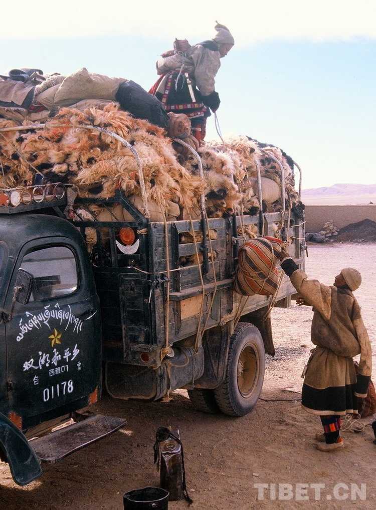 這是雙湖辦事處(現(xiàn)改為雙湖縣)和平鄉(xiāng)牧民正在裝車,通過(guò)以前的泥濘自然路外運(yùn)畜產(chǎn)品(唐召明1987年夏攝)