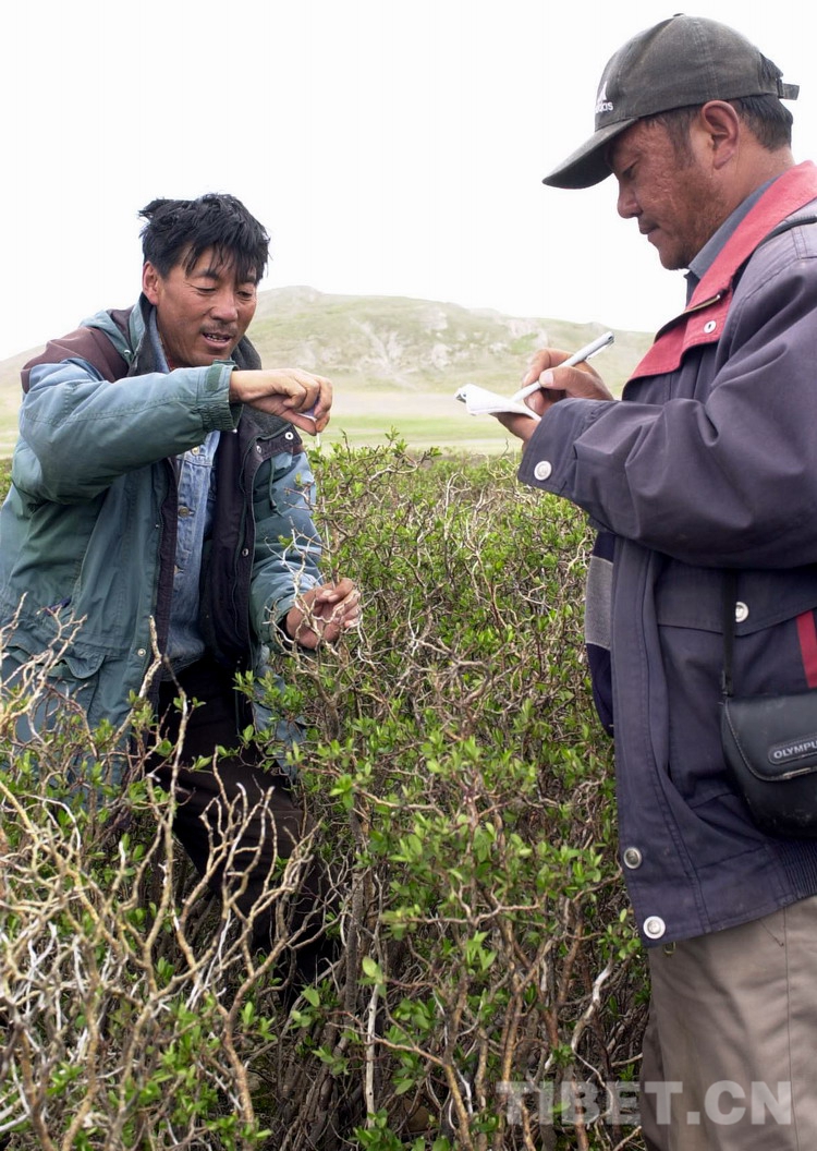 這是西藏大學(xué)化生地系副教授次仁(左)與同伴在西藏申扎縣科考中,對(duì)新發(fā)現(xiàn)的大片山柳灌木叢進(jìn)行測(cè)量(唐召明2001年攝)