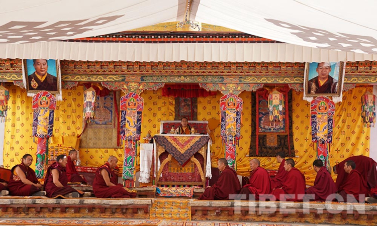 在熱堆寺,十一世班禪禮佛并為正在修建的大殿開光加持。隨后,十一世班禪在寺內(nèi)辯經(jīng)場(chǎng)為僧眾摸頂,并傳授《菩提道矩論》。