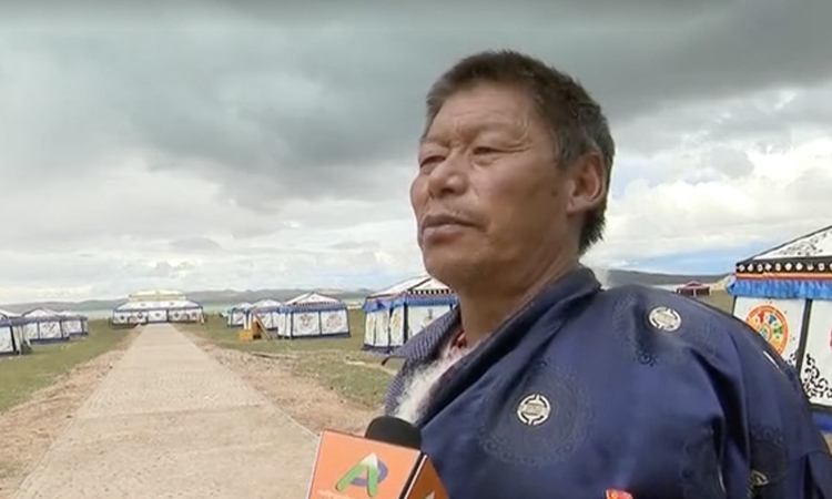 圖為羅次在“移動(dòng)帳篷”前接受采訪 圖片來源那曲廣播電視臺