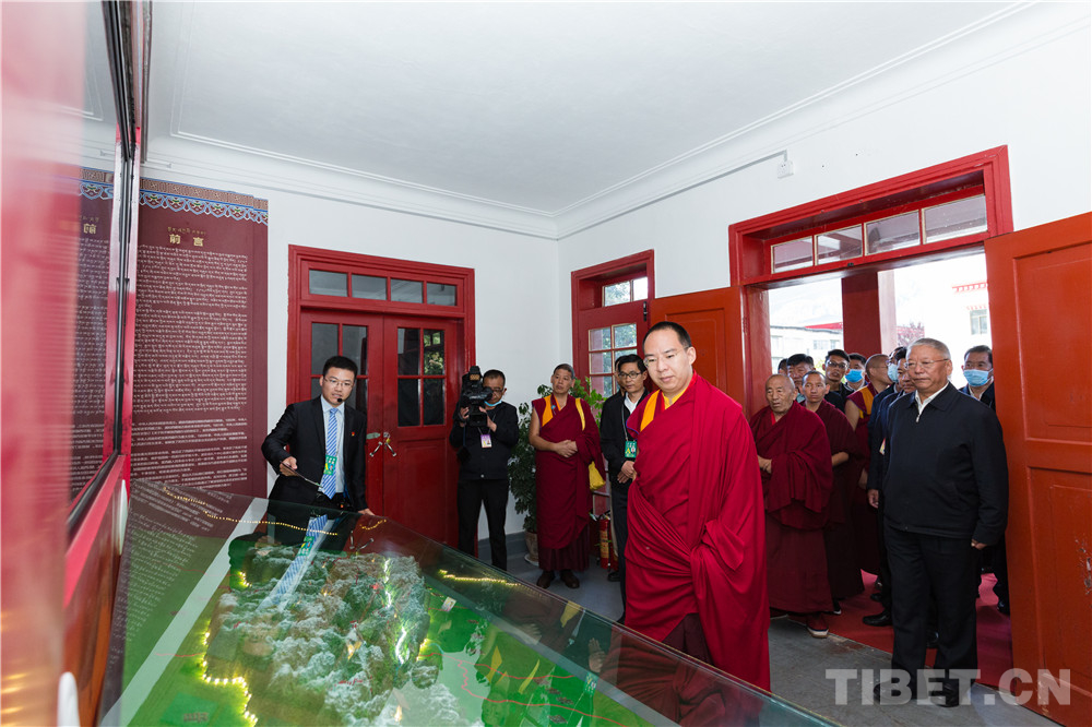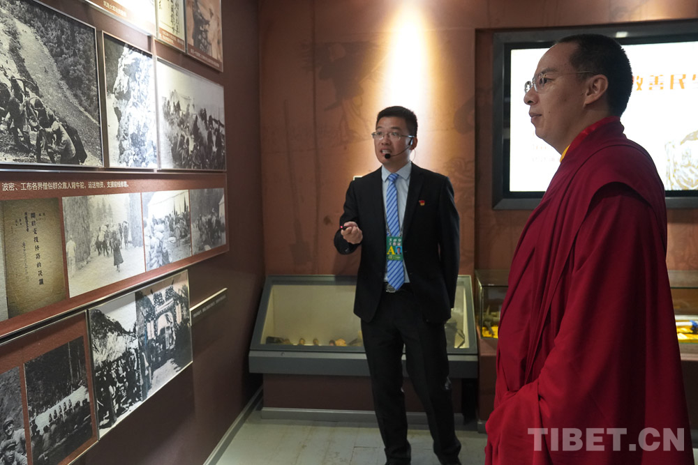 十一世班禪一路緩步前行,時(shí)而抬頭仰望、時(shí)而俯身凝視。在講解員的介紹下,從和平解放、民主改革,到社會(huì)主義建設(shè)、改革開放,再到新時(shí)代,依次參觀了各展區(qū)。