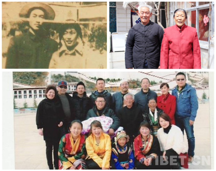△圖為一個典型的“團(tuán)結(jié)族”幸福家庭。1959年,薄金清隨部隊(duì)來到西藏,轉(zhuǎn)業(yè)后到西藏自治區(qū)氣象局工作,1960年與藏族同事、大學(xué)生中巴桑結(jié)婚。而今,全家四世同堂生活在拉薩,20多口人中有藏、漢、回三個民族。左上為薄金清和中巴桑年輕時的合影,右上為薄金清和中巴桑2017年時的合影,下圖為薄金清和中巴桑一家全家福(圖片來源于央視、西藏發(fā)布、拉薩文明網(wǎng))