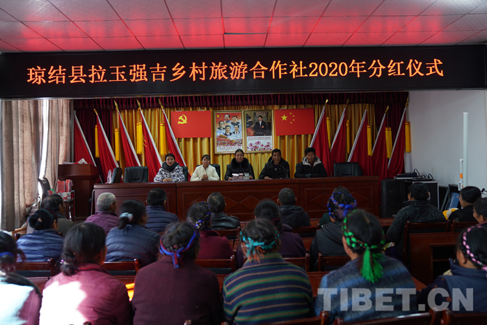 這是拉玉強(qiáng)吉鄉(xiāng)村旅游專業(yè)合作社首次分紅儀式的現(xiàn)場(chǎng),44戶村民代表臉上掛滿了笑容,準(zhǔn)備分享勤勞付出結(jié)出的香甜碩果。