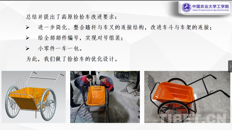啟動會上,高原撿拾車研發(fā)首席專家中國農業(yè)大學工學院教授王光輝介紹了高原撿拾車最新改版的情況。他表示,針對過去推廣中發(fā)現(xiàn)的個別問題,對車子進行了優(yōu)化設計,去掉了易發(fā)生損壞的控叉線閘,調整了車身的踏桿與車叉的連接結構,改進車斗與車架的連接,做到了對號組裝和小零件一車一包等,使安裝更加便捷、使用更加方便、車子更加堅固。