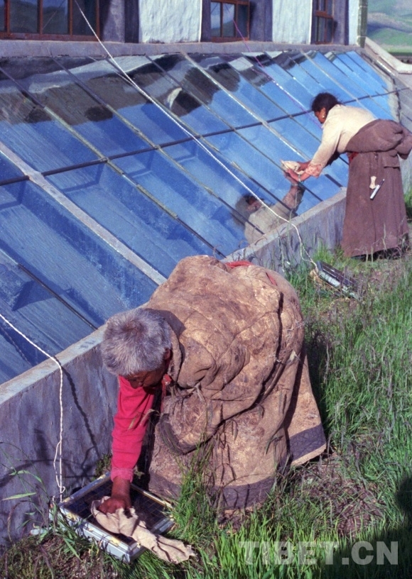 圖為藏北那曲縣(現(xiàn)改為色尼區(qū))建成的集太陽(yáng)能采暖、硅光照明、太陽(yáng)灶做飯的養(yǎng)老院。圖為五保戶老人正在擦拭采暖房玻璃和硅光電池板 唐召明1988年攝