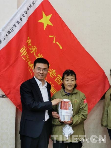 圖為原十八軍52師副政委、西藏自治區(qū)黨委原第一書記陰法唐中將之女陰建白代表父親向波密紅樓捐贈(zèng)紅色書籍