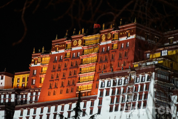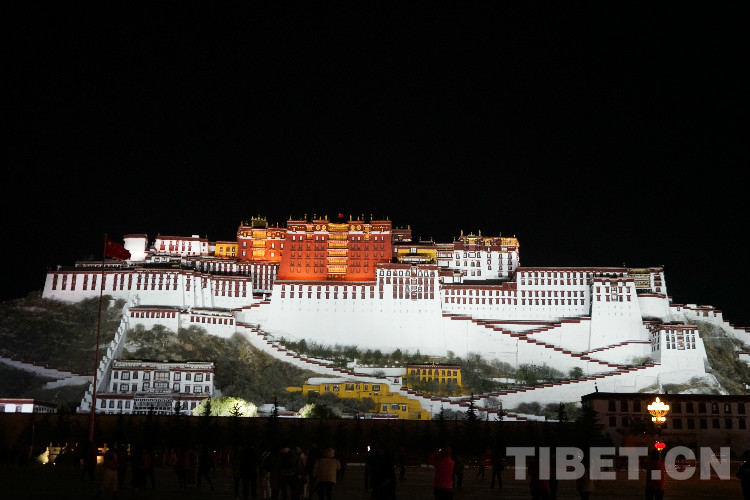 圖為布達拉宮廣場東側(cè)湖面處的夜景