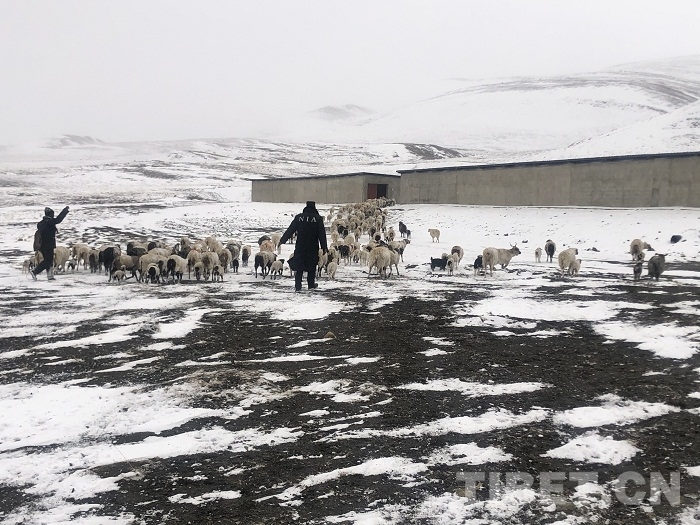 圖為崗巴邊境派出所民警幫助牧民轉(zhuǎn)移羊群