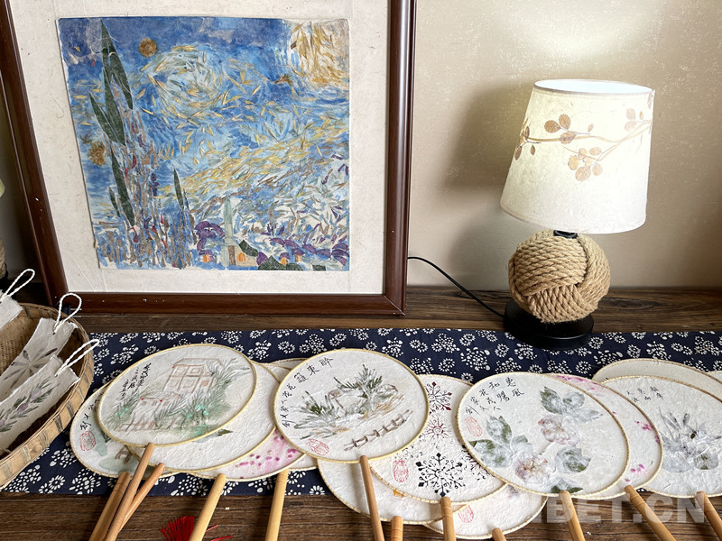 圖為扇子、臺燈等各式古法紙文創(chuàng)產(chǎn)品