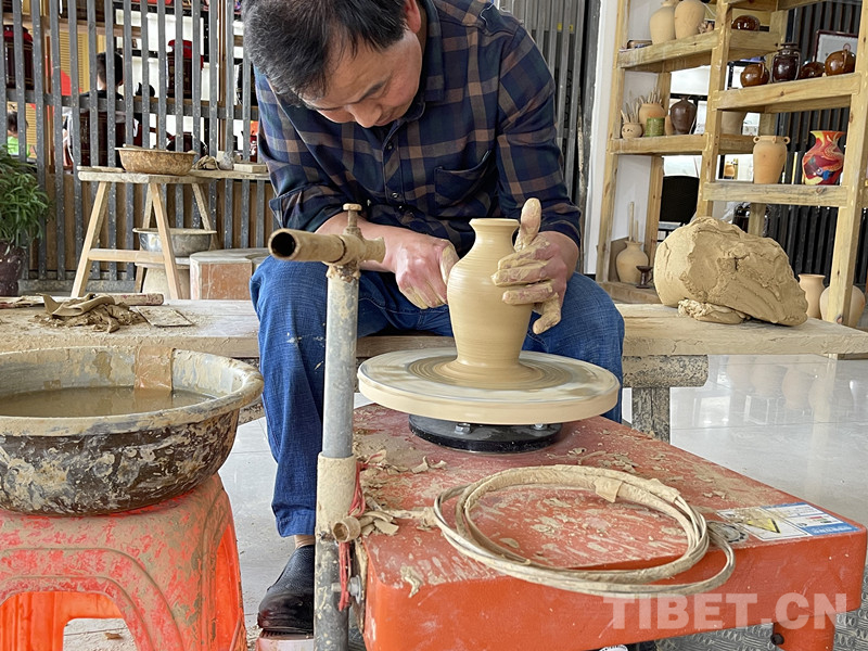 花茂村的土陶制作有著140多年的歷史,53歲的母先才是家族制陶的第四代傳人,也是土陶非遺文化傳承人。在母先才的陶藝體驗館里,擺放著各種成品,供游客觀摩、選購,還有數(shù)十臺拉坯機,供游客或?qū)W徒們使用。