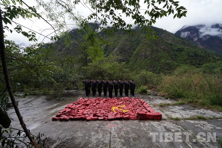 圖為聶拉木邊檢站民警用石頭堆砌的黨旗全景 攝影:鄒興國
