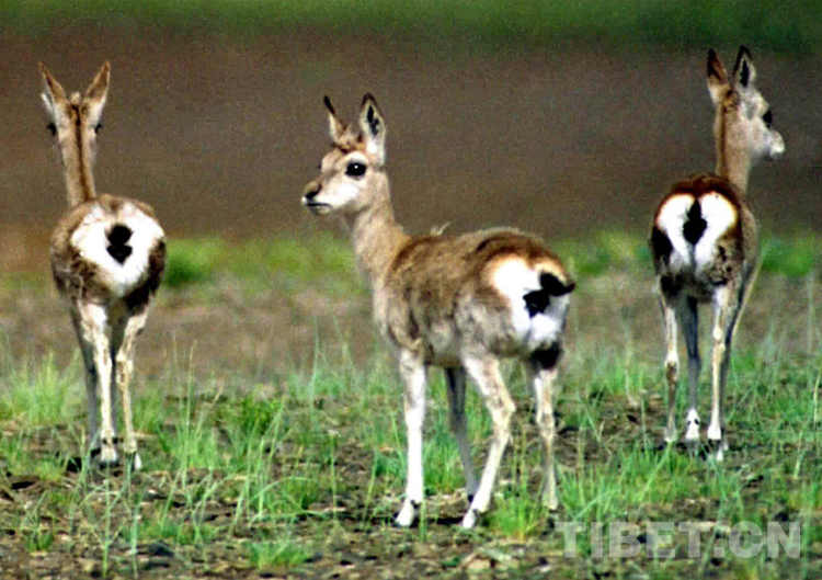 藏原羚(俗稱黃羊),元月份是交配期,當年7月份是產羔期。它們個子不高,小巧而靈活,最明顯的標志是屁股上有塊心形的白色印記,黑色的小尾巴搭在白屁股上,跑起來一甩一甩的,樣子十分可愛。它們少則三五只,多則幾十只甚至上百只一起活動。這種動物在藏北草原最為常見。