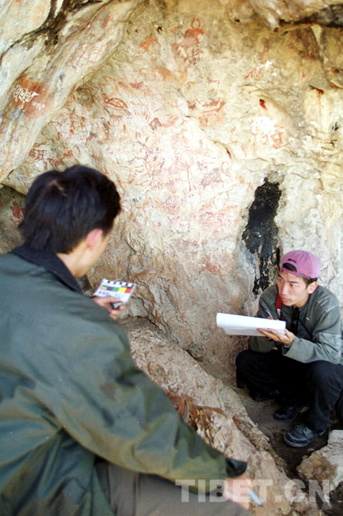 這是藏北無(wú)人區(qū)科考團(tuán)科考人員在對(duì)班戈縣洞窟巖畫進(jìn)行科學(xué)考察(唐召明2001年攝)