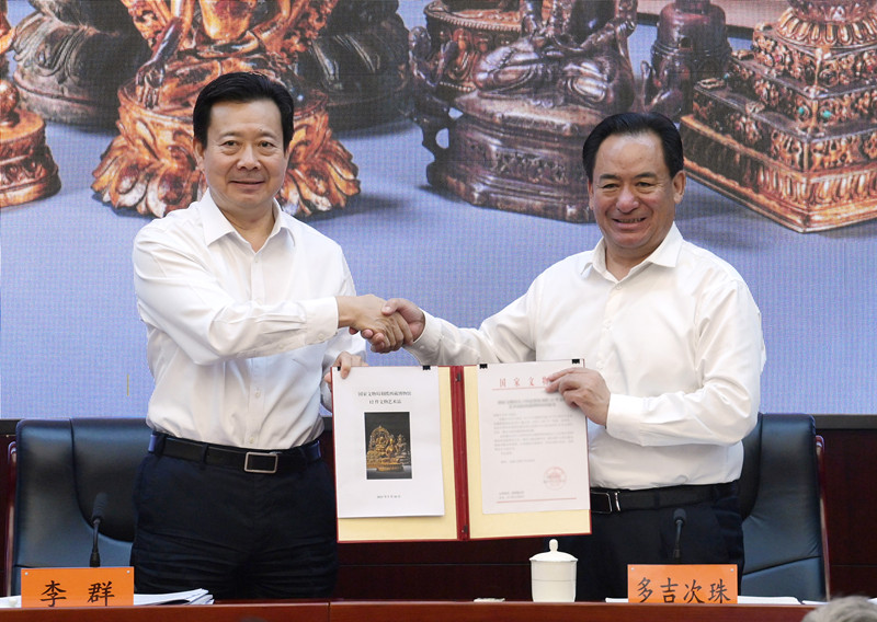 圖為文化和旅游部副部長、國家文物局局長李群(左)與西藏自治區(qū)人民政府副主席多吉次珠交接文物劃撥清冊 國家文物局供圖 攝影:新華社記者 李賀