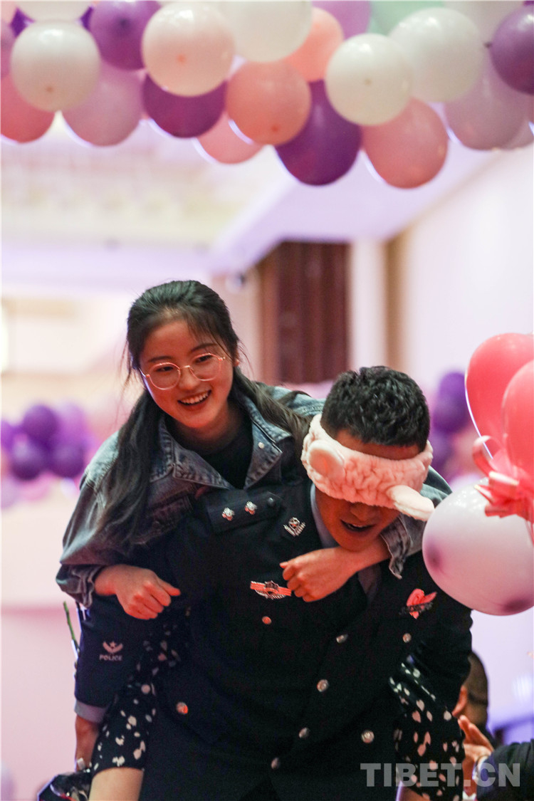活動(dòng)過(guò)程中,總站形象宣傳片《我是誰(shuí)》,向女嘉賓們展現(xiàn)了西藏移民管理警察的職業(yè)特點(diǎn),使女嘉賓對(duì)民警工作職責(zé)產(chǎn)生了初步的認(rèn)識(shí)。在主持人的引導(dǎo)下,精彩的才藝展示和豐富的游戲環(huán)節(jié)很快將現(xiàn)場(chǎng)氣氛推向一個(gè)接一個(gè)的高潮?;?dòng)游戲“牽手牽愛(ài)”“心有靈犀”“守護(hù)愛(ài)情”“唯愛(ài)接力”通過(guò)聆聽(tīng)詩(shī)句抓緊手指、借助比劃你問(wèn)我答,相互協(xié)助完成任務(wù)等方式增進(jìn)了男女嘉賓之間的了解和默契,促進(jìn)了相互之間更好交流。男女嘉賓才藝表演和日喀則邊境管理支隊(duì)1753樂(lè)隊(duì)送上的精彩曲目,令活動(dòng)現(xiàn)場(chǎng)青春洋溢。最終,18對(duì)男女嘉賓互生情愫,牽手成功,36對(duì)交換聯(lián)系方式,開(kāi)啟更加深入的幸福交流。