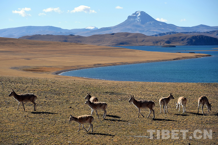 湖濱河畔,地勢(shì)平坦開闊,水草豐盛甜美,是藏羚羊頻繁活動(dòng)的場(chǎng)所。藏羚羊是一種善跑的動(dòng)物,跑起來(lái)輕快灑脫、疾如長(zhǎng)風(fēng),時(shí)速可達(dá)80公里。