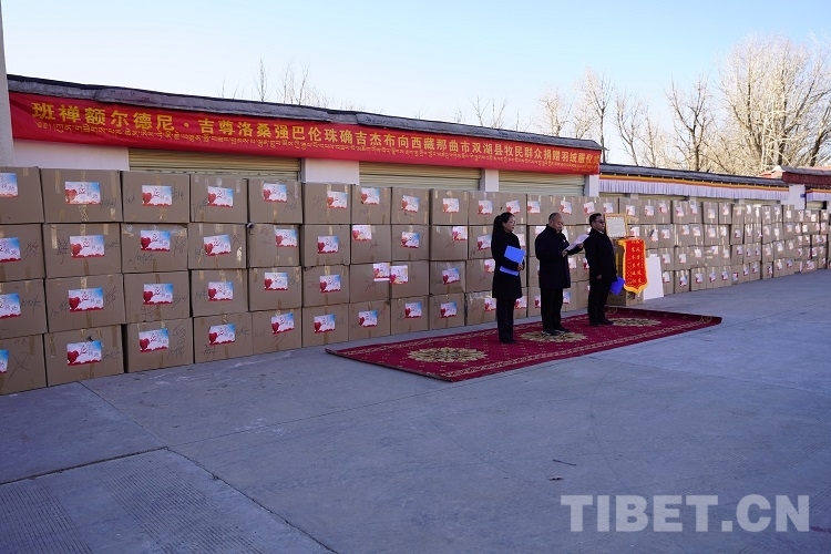 捐贈儀式上,雙湖縣副縣長普珍和農(nóng)業(yè)農(nóng)村局局長次仁達(dá)瓦代表雙湖縣縣委、縣政府和廣大基層牧民群眾接受捐贈并向班禪表示感謝。