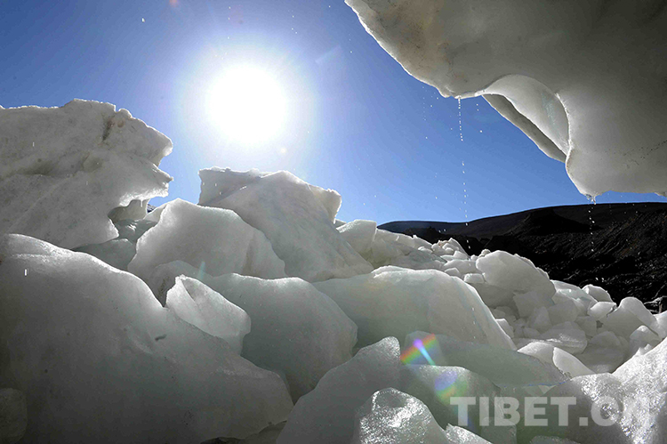 此外,被稱(chēng)為除南極、北極以外的世界第三大冰川——普若崗日冰川的融水痕跡也很明顯,冰原外圍冰體常見(jiàn)掛滿融水的冰凌;常見(jiàn)正在融化、殘留地面的許多冰塊及那些從冰川下裸露出的大大小小的石頭。