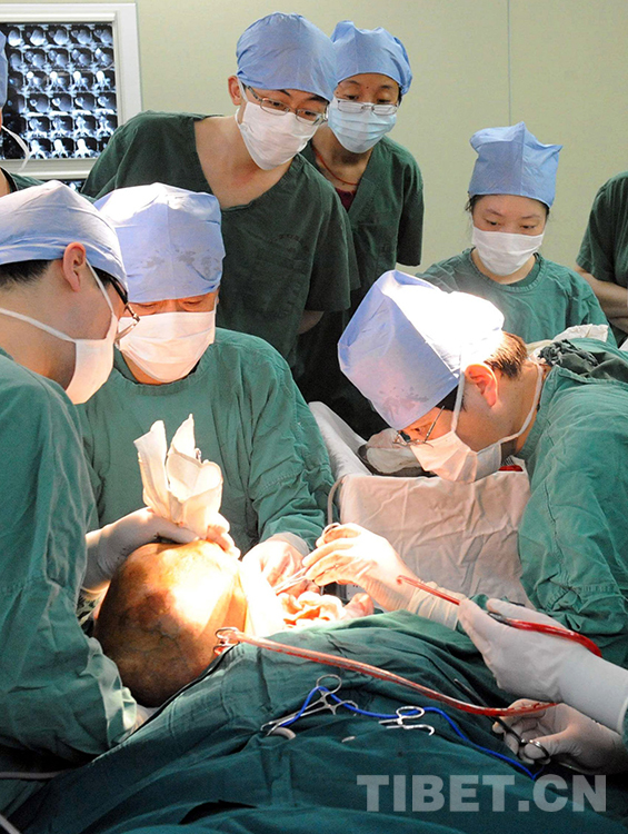 這是北京口腔醫(yī)院口腔頜面外科醫(yī)生在為牧女斯求卓瑪實(shí)施手術(shù),將其脖子上一個(gè)重達(dá)5公斤的巨大腫瘤成功切除(唐召明2010年4月21日攝)