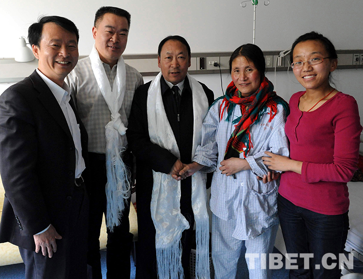 這是時(shí)任全國(guó)婦聯(lián)副主席甄硯(右一)受時(shí)任十一屆全國(guó)人大常委會(huì)副委員長(zhǎng)陳至立委托,到北京口腔醫(yī)院看望斯求卓瑪,并送來(lái)慰問(wèn)金(唐召明2010年4月14日攝)
