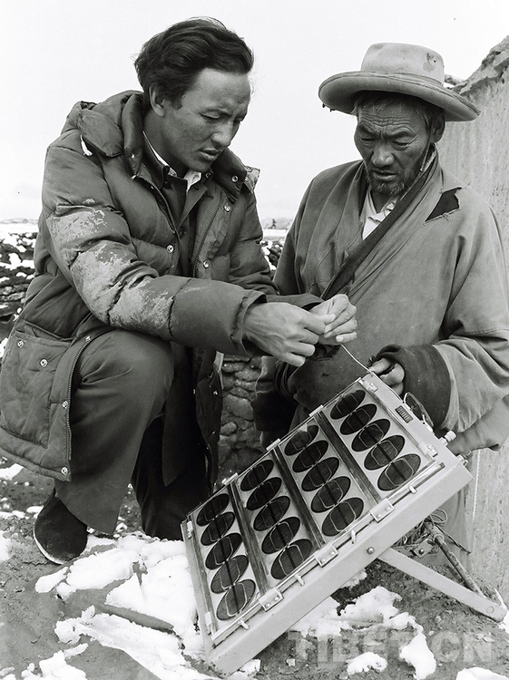 這是那曲地區(qū)風(fēng)能試驗(yàn)站站長次真在風(fēng)力發(fā)電機(jī)試點(diǎn)鄉(xiāng)的那曲地區(qū)那曲縣(現(xiàn)那曲市色尼區(qū))德吉鄉(xiāng)指導(dǎo)牧民群眾使用太陽能硅光電池板(唐召明1987年攝)