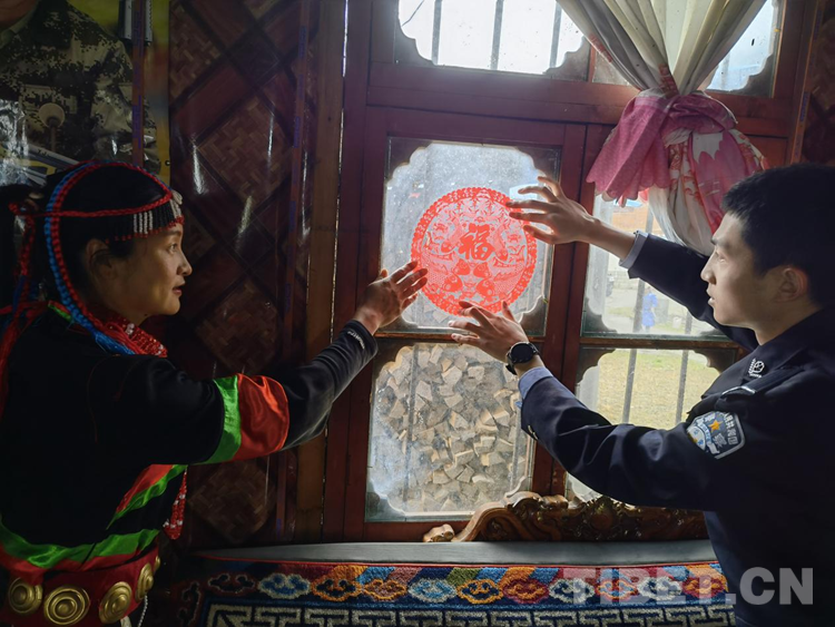 圖為林芝達(dá)木邊境派出所民警與轄區(qū)群眾共度春節(jié),為家里貼春聯(lián) 攝影:王濤