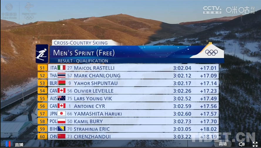 圖為北京冬奧會越野滑雪個人短距離(自由技術)資格賽成績