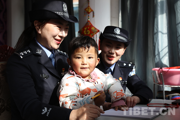 圖為聶拉木出入境邊防檢查站女民警為康珠小朋友輔導寫字并為其送上藏歷新年祝福 攝影:索朗次仁