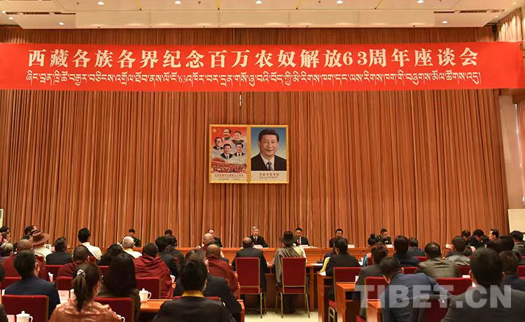 圖為西藏各族各界紀(jì)念百萬農(nóng)奴解放63周年座談會(huì)現(xiàn)場(chǎng) 攝影:王媛媛