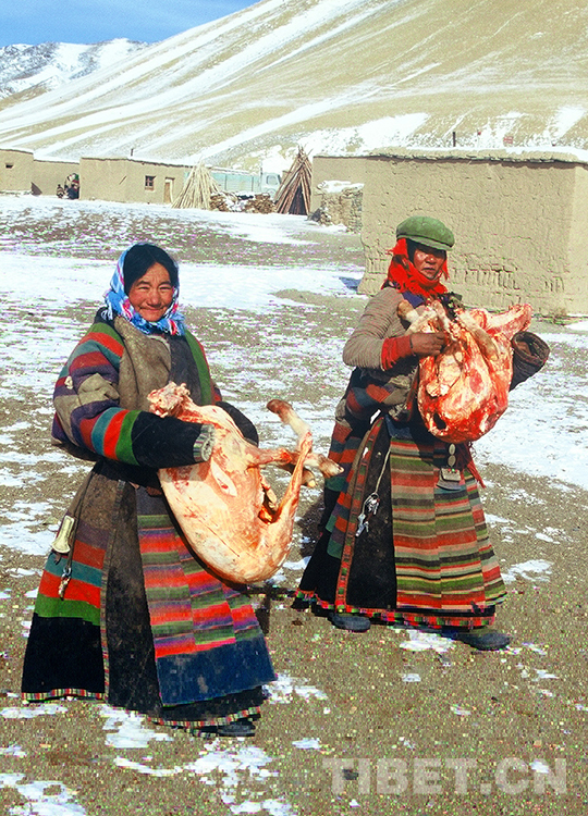 這是雙湖特別區(qū)(現(xiàn)雙湖縣)嘎措鄉(xiāng)一村兩位牧女從村里倉(cāng)庫(kù)領(lǐng)到集體分配的羊肉回家(唐召明2001年攝)