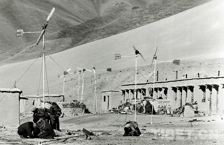 這是那曲地區(qū)(現(xiàn)那曲市)風(fēng)能實(shí)驗(yàn)站的技術(shù)工人在幫助嘎措鄉(xiāng)一村村民維修保養(yǎng)風(fēng)力發(fā)電機(jī)(唐召明1988年攝)